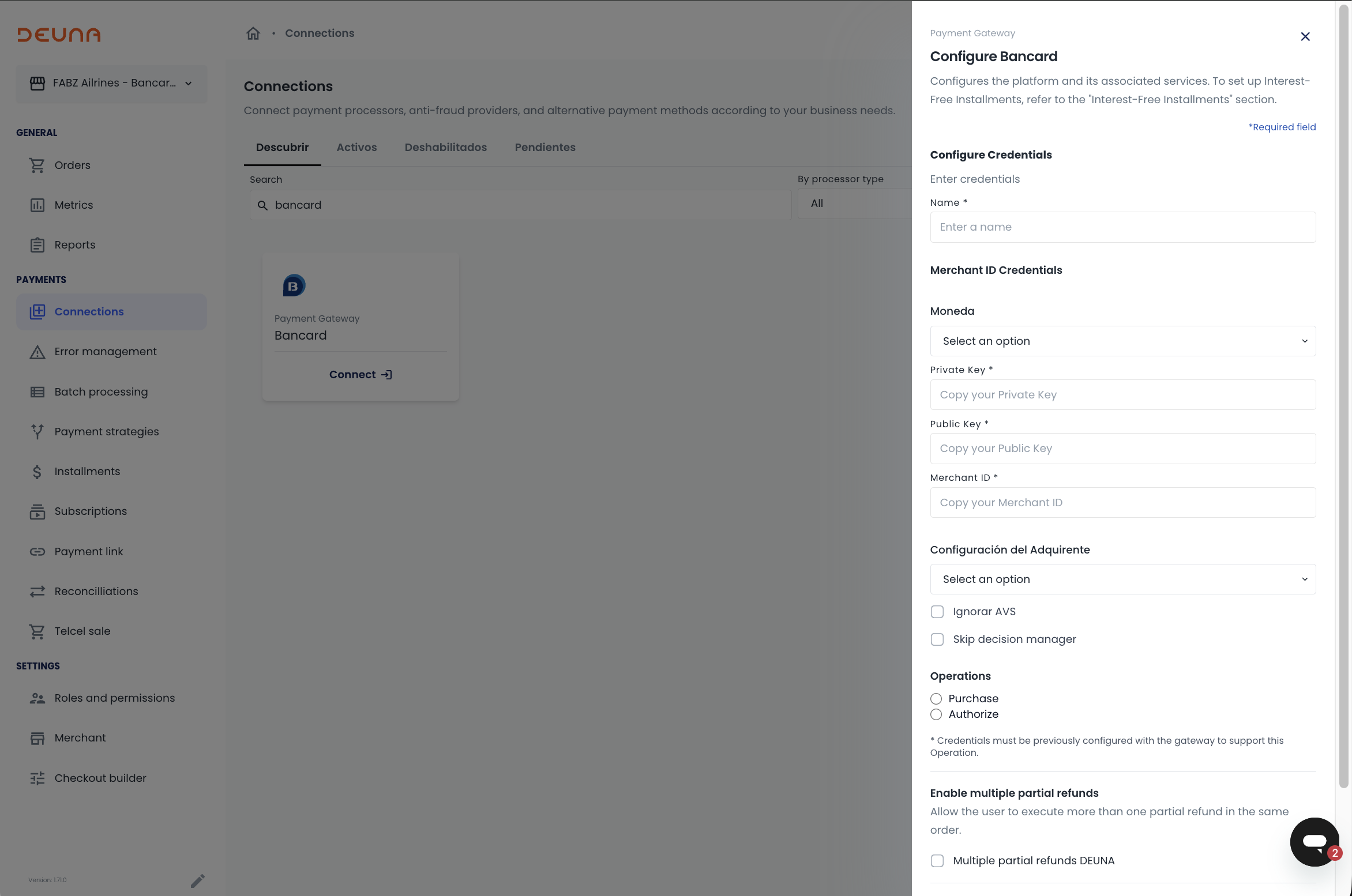 - Choose if you want to activate, DEUNA´s Multiple Partial Capture, Multiple Partial Refund and/or 3DS DEUNA.
