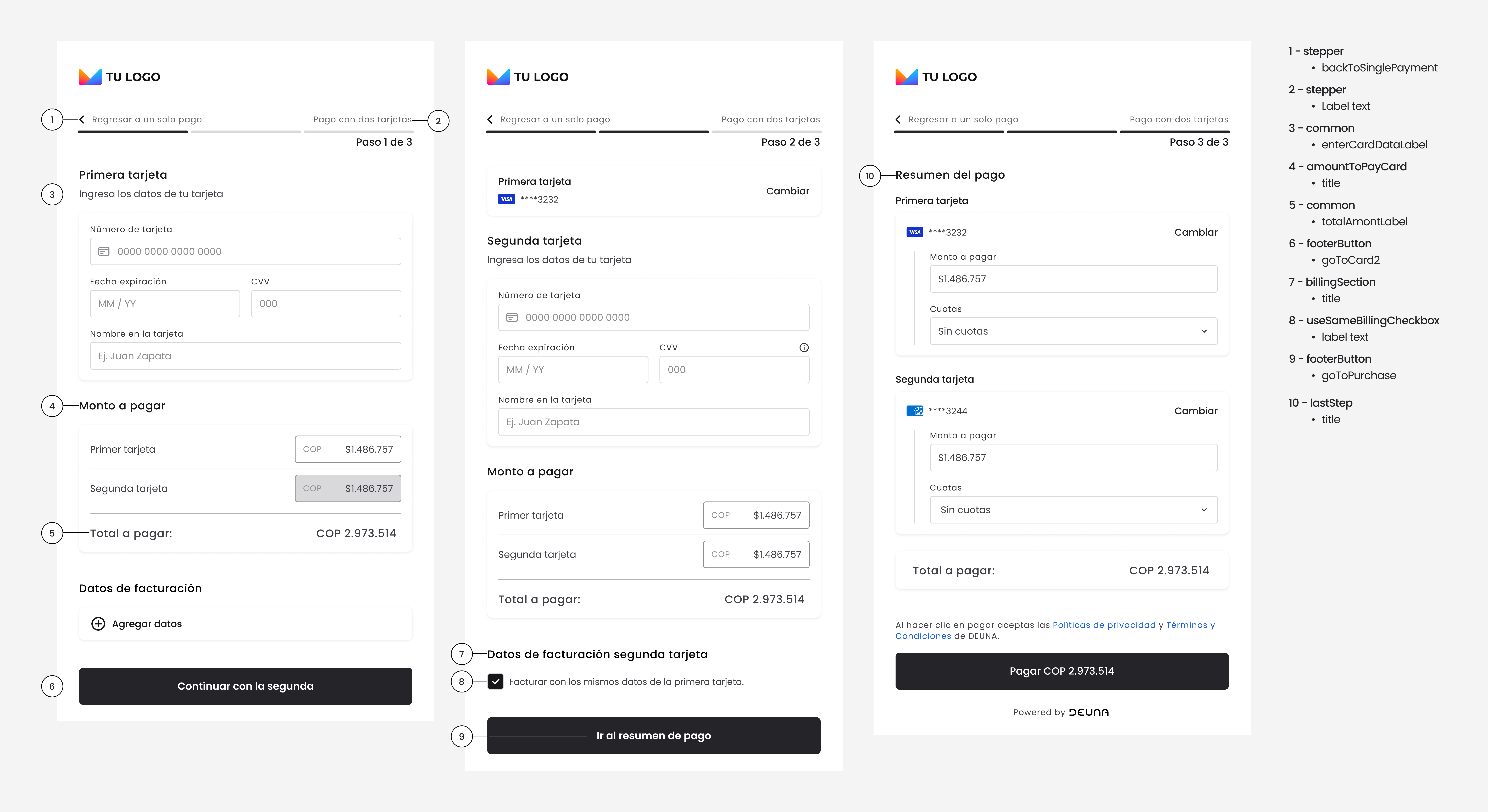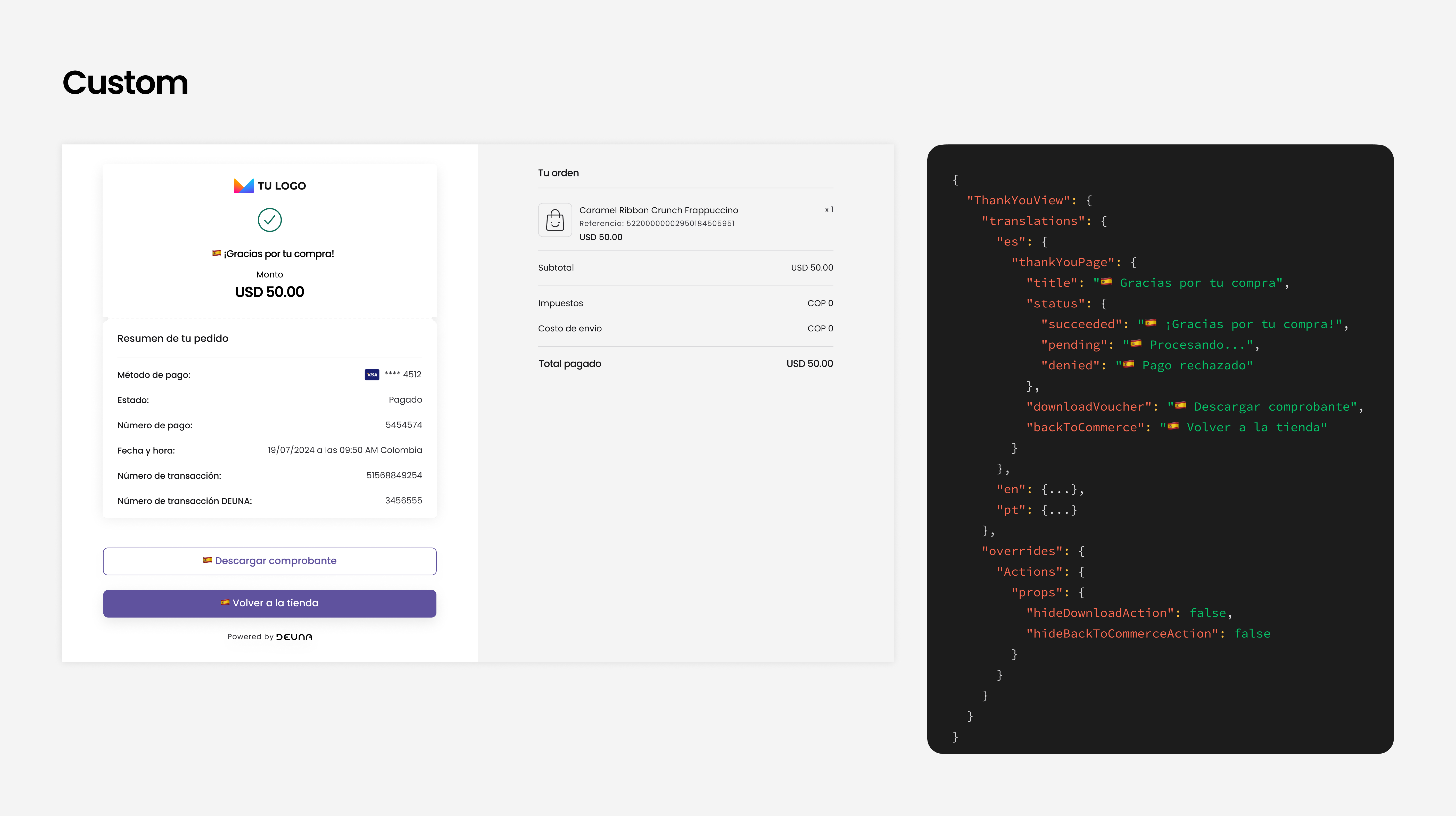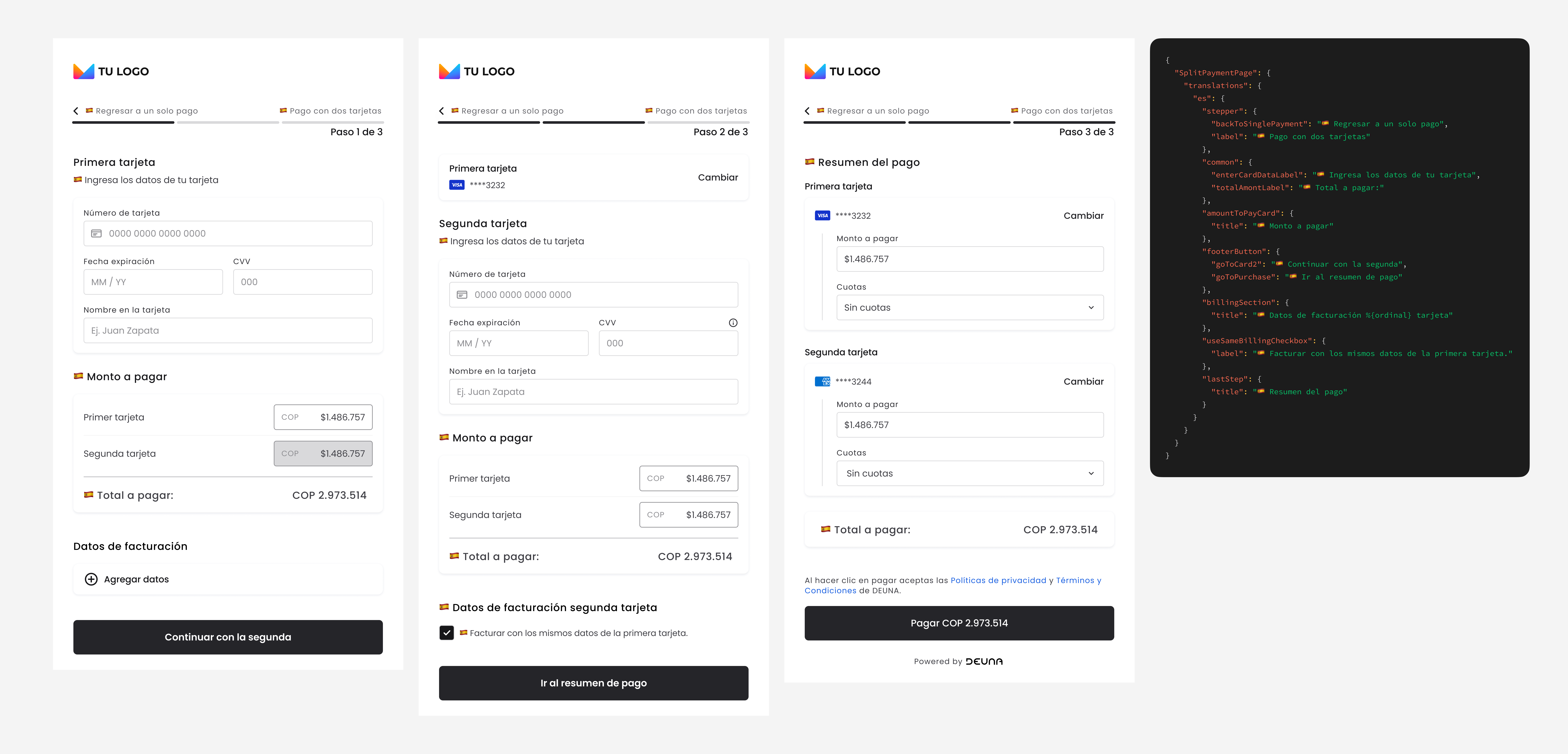 DEUNA allows you to visually adapt the checkout to align with your brand's visual identity. This guide describes how to configure the JSON file that controls widget styles, including colors, typography, borders, text, and specific views.
