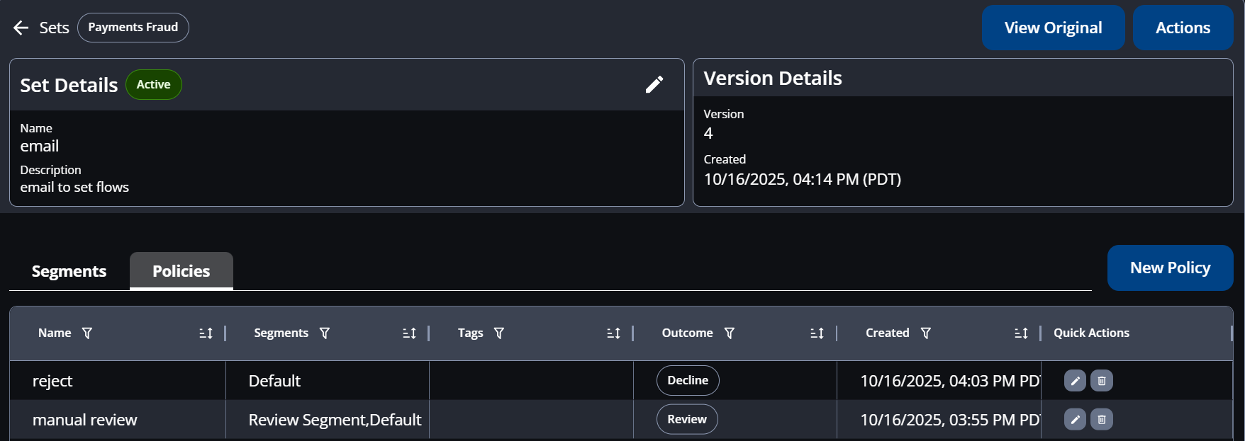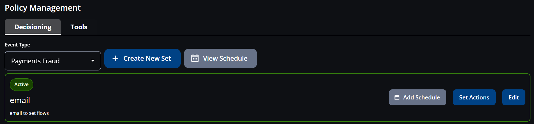 In the Decisioning tab select “Payments Fraud” in the Event dropdown