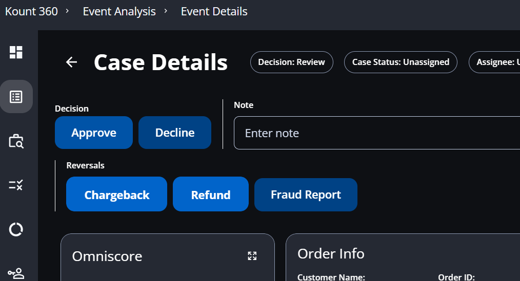 In Manual Review you can approve or deny the transactions manually in Kount’s dashboard. When selecting the transaction in the Event Analysis section, and “Approve” or “Decline”.