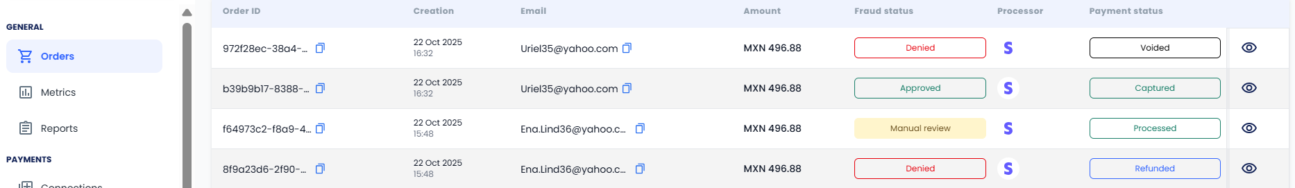 Finally, review the transactions in the Admin, in the Fraud section should appear the following values: Approved, Denied, or Manual Review.