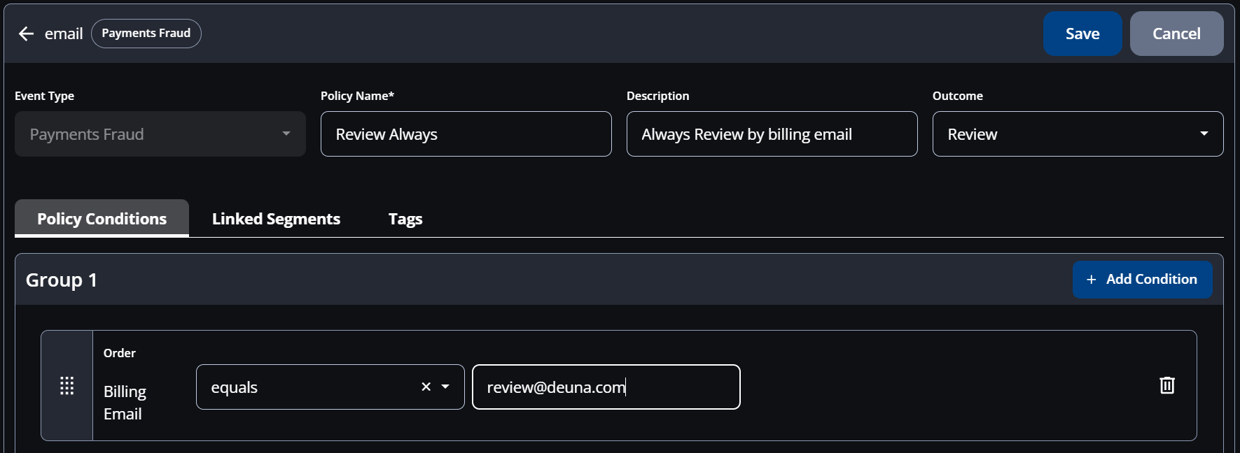 In Policy Name write “Review Always”, in Description “Always Review by billing email”, and select “Review” from the “Outcome” dropdown.
