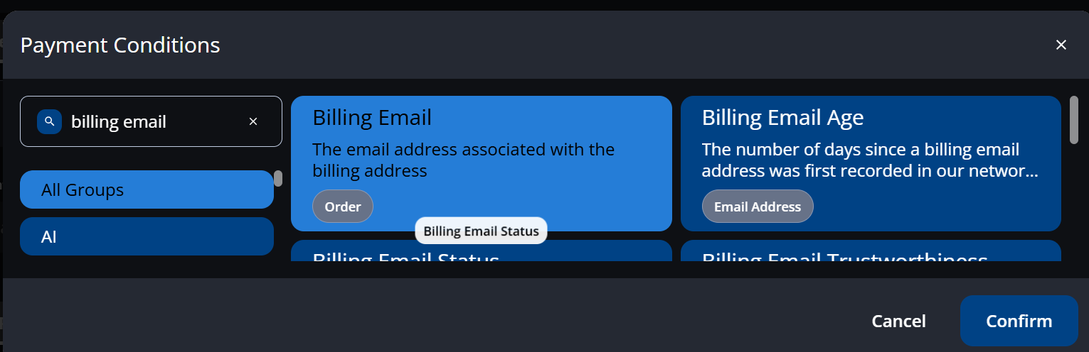 Now select “Add condition” from the “Policy conditions” tab, and in search conditions write “billing email”, select it from the results, and then “Confirm”