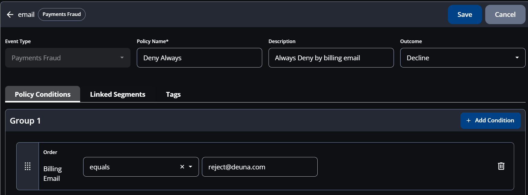 Start creating the policy to deny always the transaction, in Policy Name write “Deny Always”, in Description “Always deny by billing email”, and in outcome select “Decline” from the Dropdown