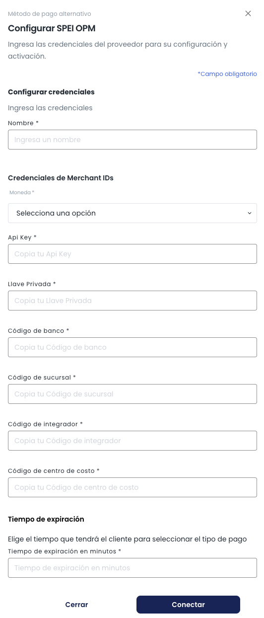 - In Expiration Time enter the SPEI OPM’s expiration time in minutes.