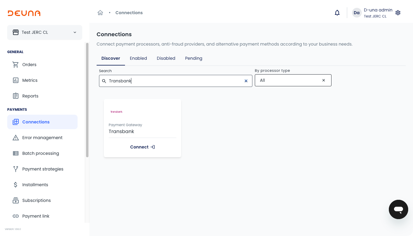 From this point on, you can now process transactions with Transbank through DEUNA.