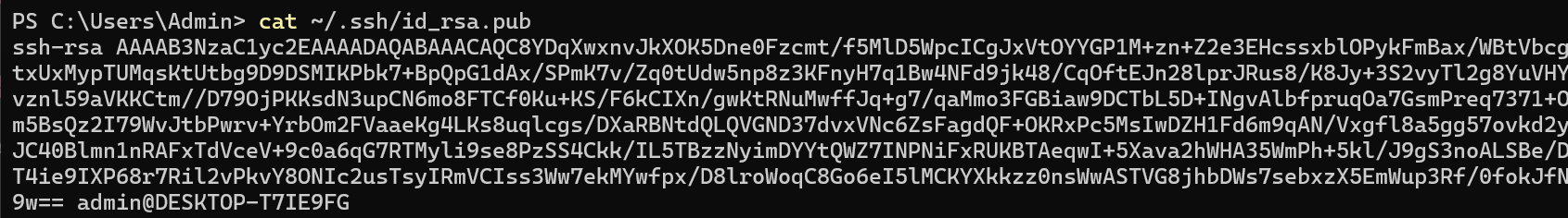 cat ~/.ssh/id_rsa.pub, you will receive a response with the key like the following example: