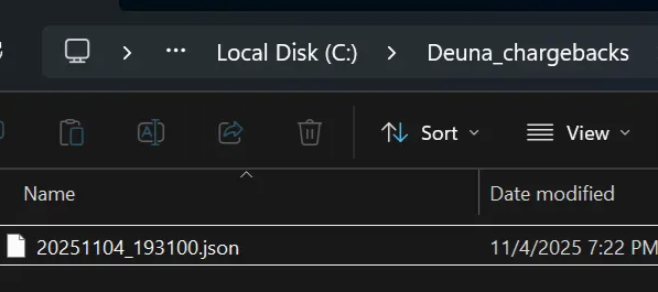 get YYYYMMDD_HHMMSS_output.json, whereYYYYMMDD_HHMMSSis the timestamp of the chargeback file uploaded previously. - The file will be downloaded to the folder where the chargeback file is located